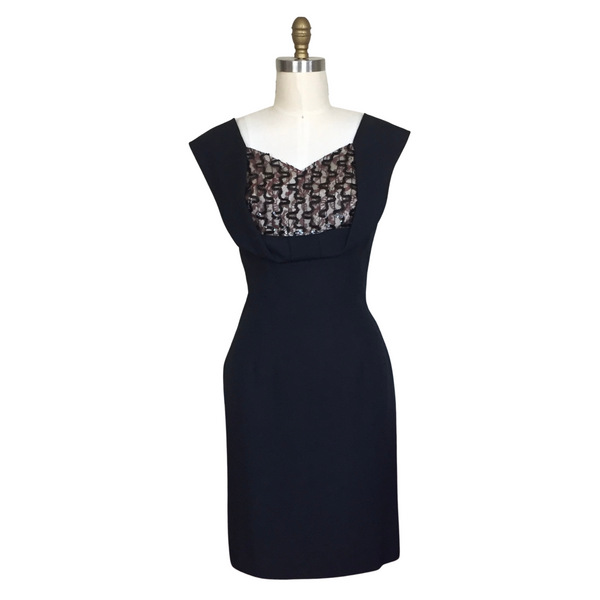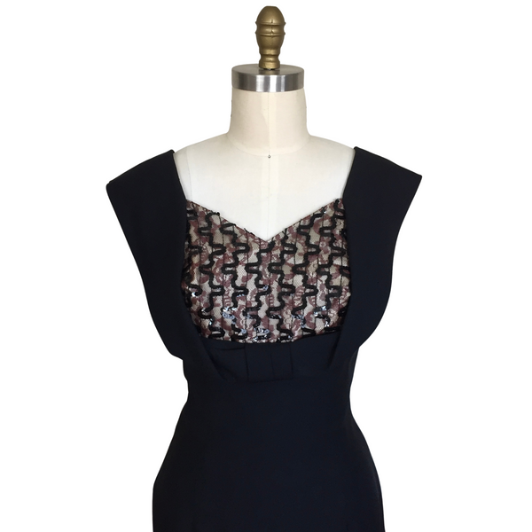 CLASSIC 1960s BLACK SEQUIN WIGGLE DRESS. COMPLETES YOUR PINUP LOOK.