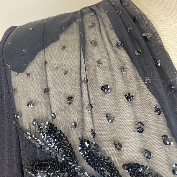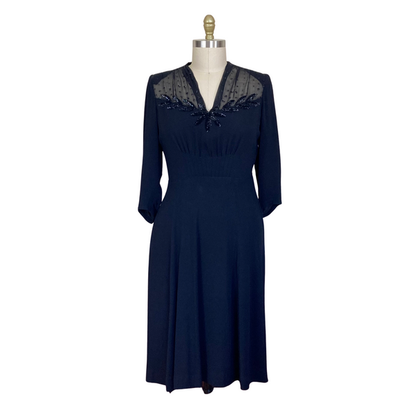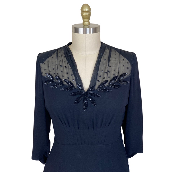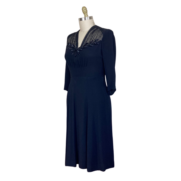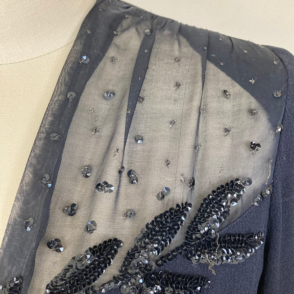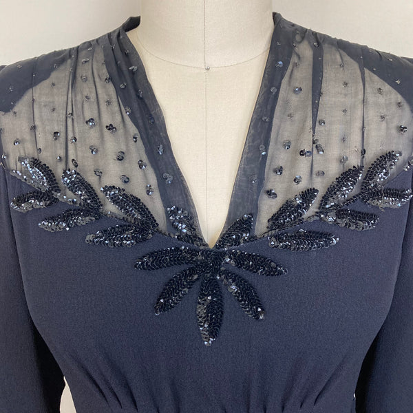 1940s BLACK CREPE & SEQUIN DETAIL DRESS {WAIST 34 INCHES}