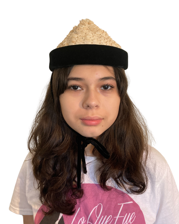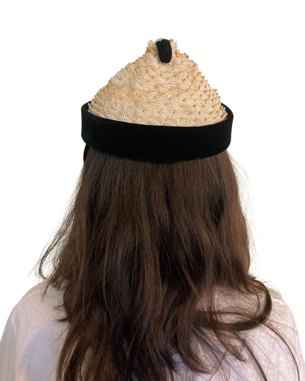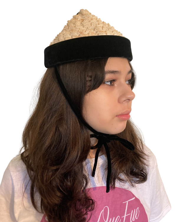 1940s BLACK VELVET TRIM & BEIGE POINTED PEAK HAT