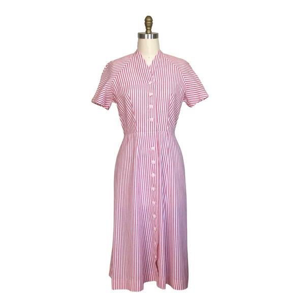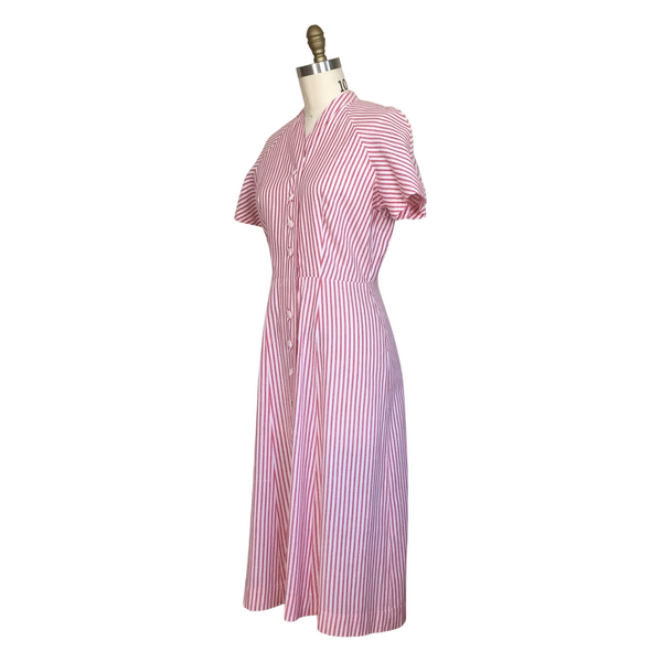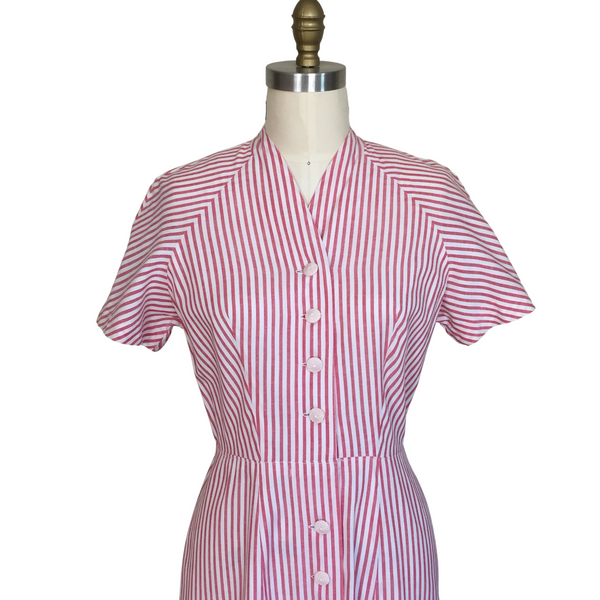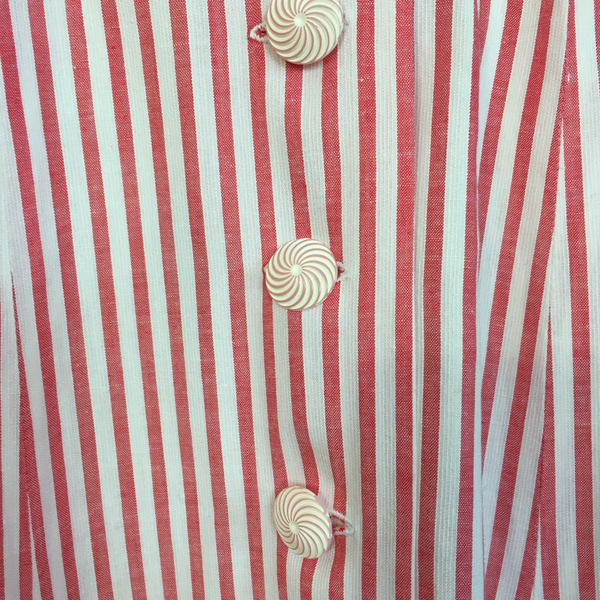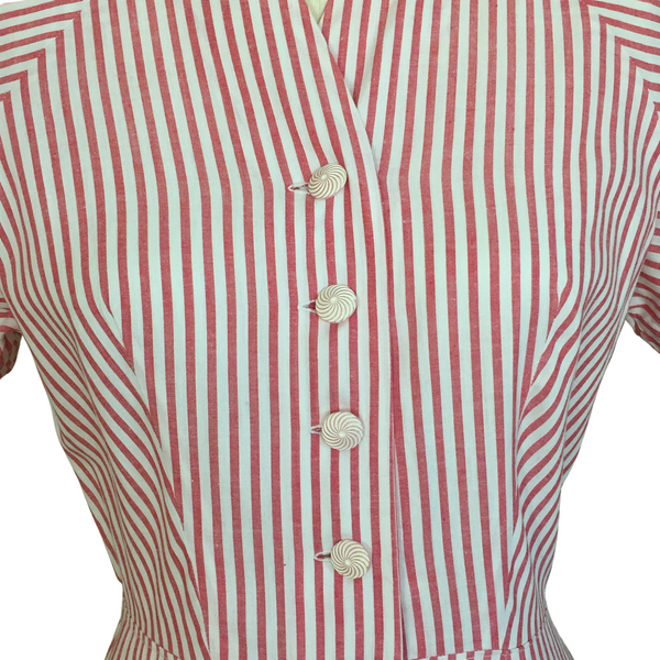 DARLING 1940s RED & WHITE STRIPED DRESS WITH DECORATIVE MATCHING BUTTONS.