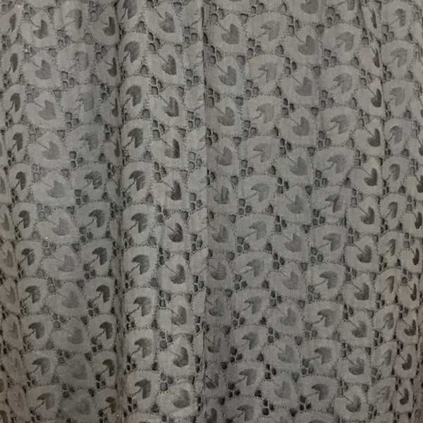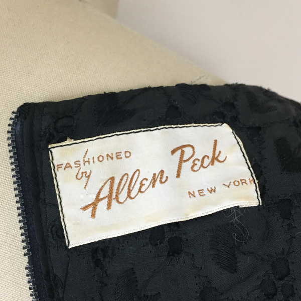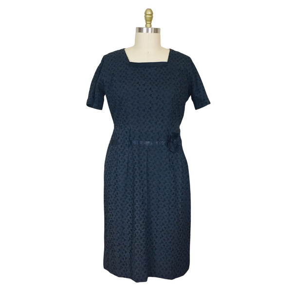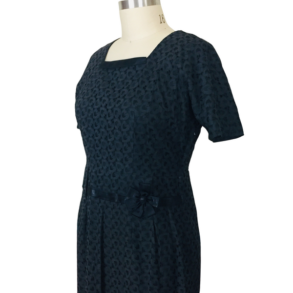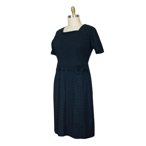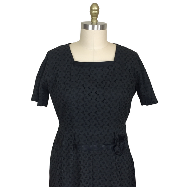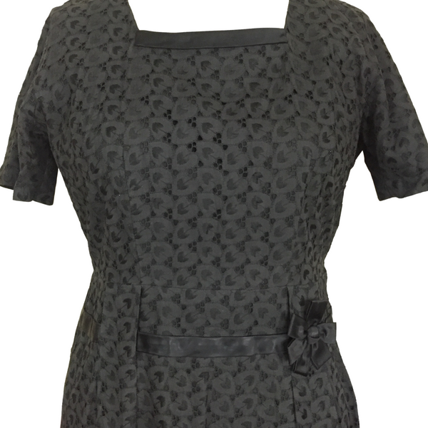 1950s BLACK EYELET DRESS WITH A LOWER WAIST SATIN BOW. THE EYELET SHAPE APPEARS TO BE HEART SHAPED.