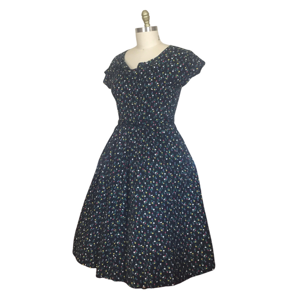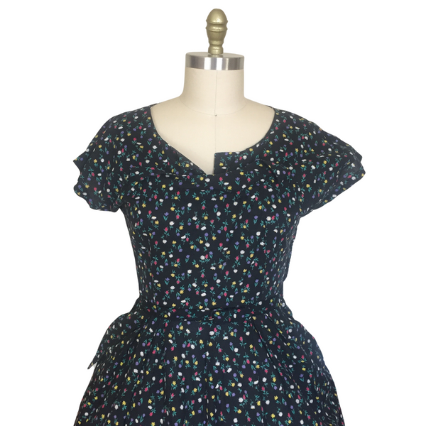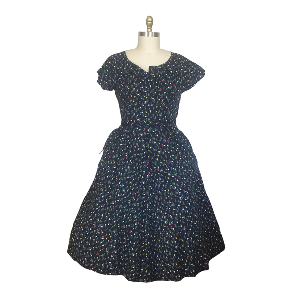A SWEET 1950s BLACK SMALL FLORAL PRINT FULL SKIRT DRESS. THE DRESS COMES A MATCHING BELT AND SIDE HIP POCKETS.