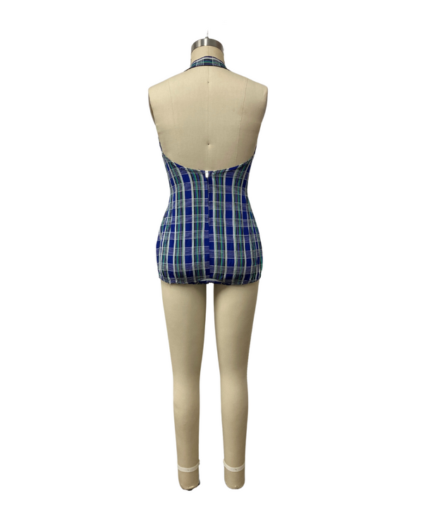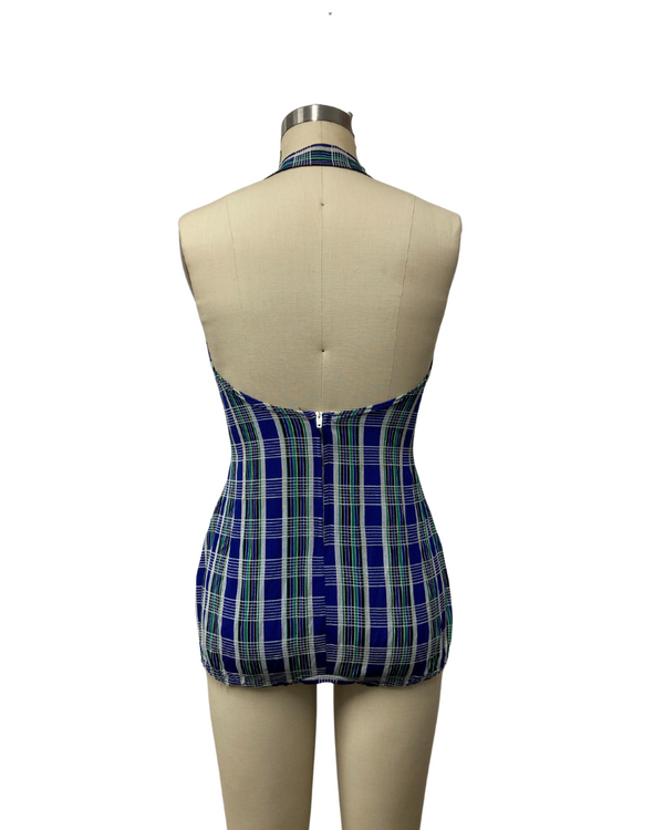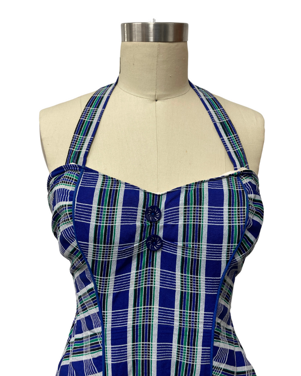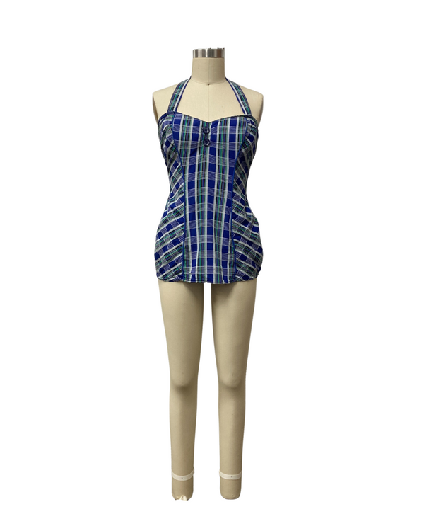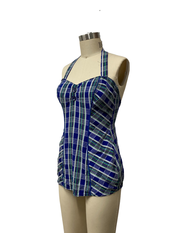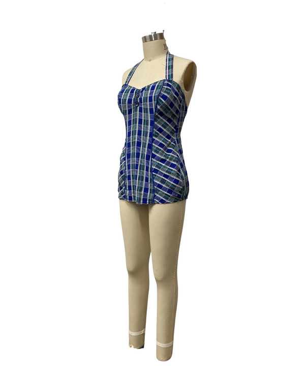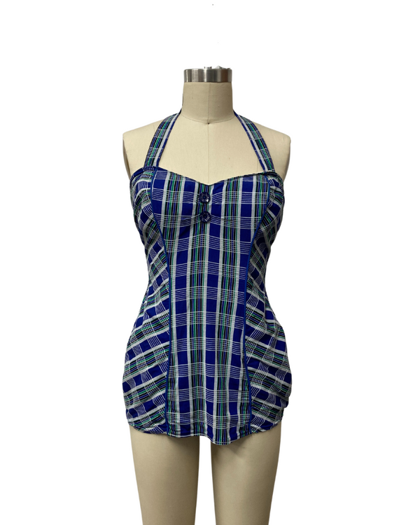1950s BLUE & GREEN PLAID HALTER SWIMSUIT {WAIST 30 INCHES}