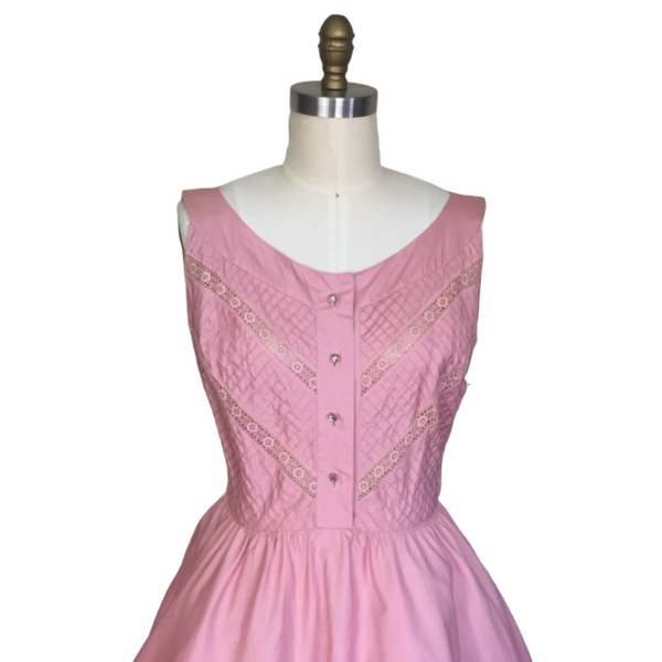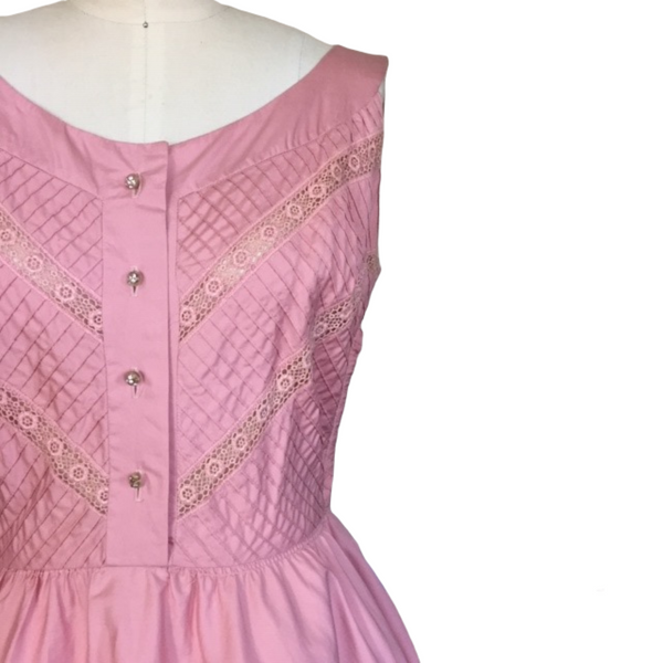 A 1950s SOFT LIGHT PINK FULL SKIRT DRESS. THE BODICE HAS LACE ACCENTS ACROSS THE FRONT ALONG WITH ENCRUSTED RHINESTONE BUTTONS. A VERY SWEET DRESS.