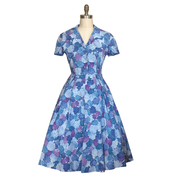 1950s PURPLE & BLUE FLORAL FULL SKIRT DRESS {WAIST 29 INCHES}