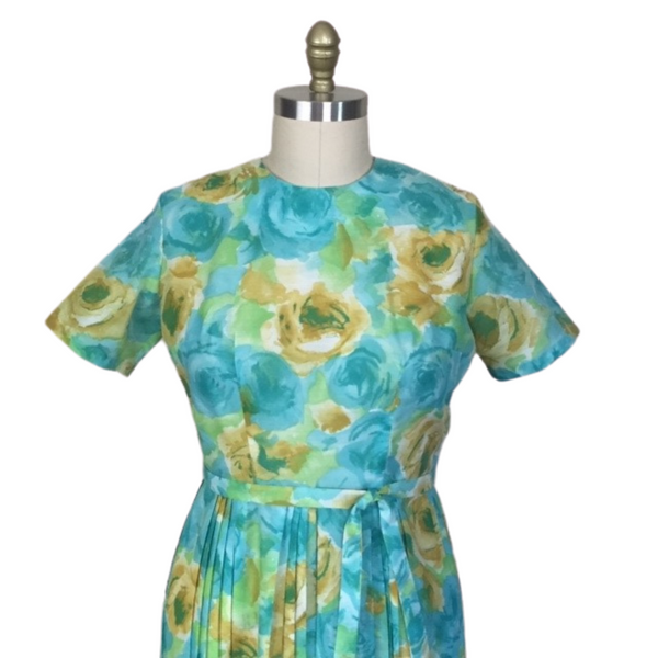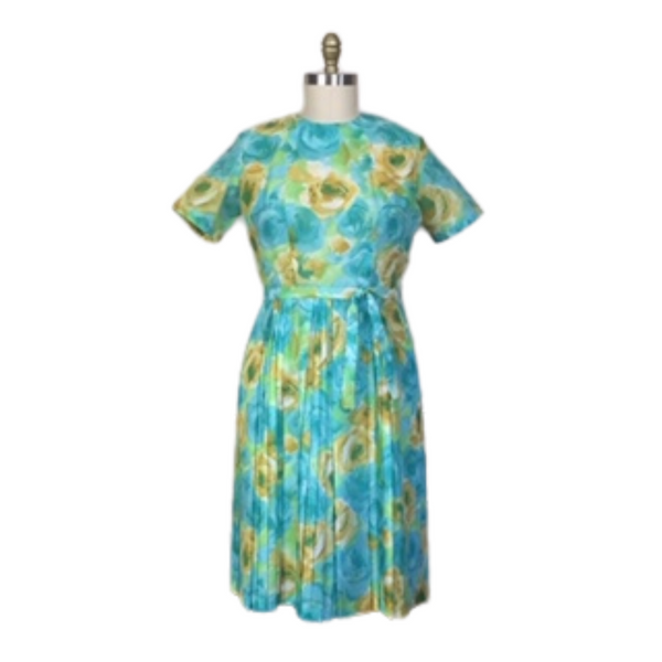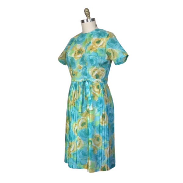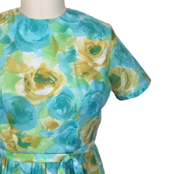 1960s LIME & TURQUOISE FLORAL PLEATED DRESS {WAIST 32 INCHES}