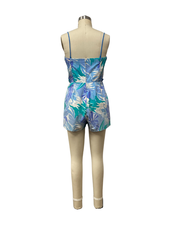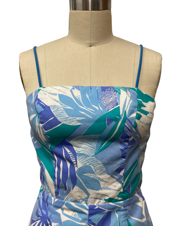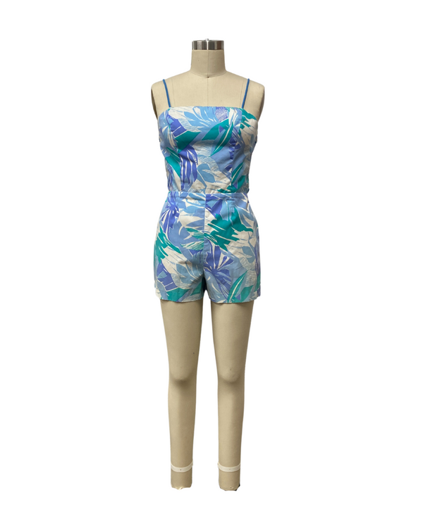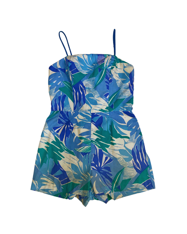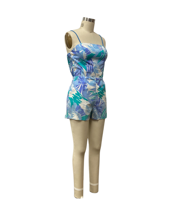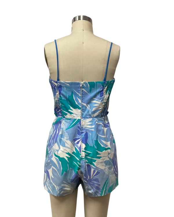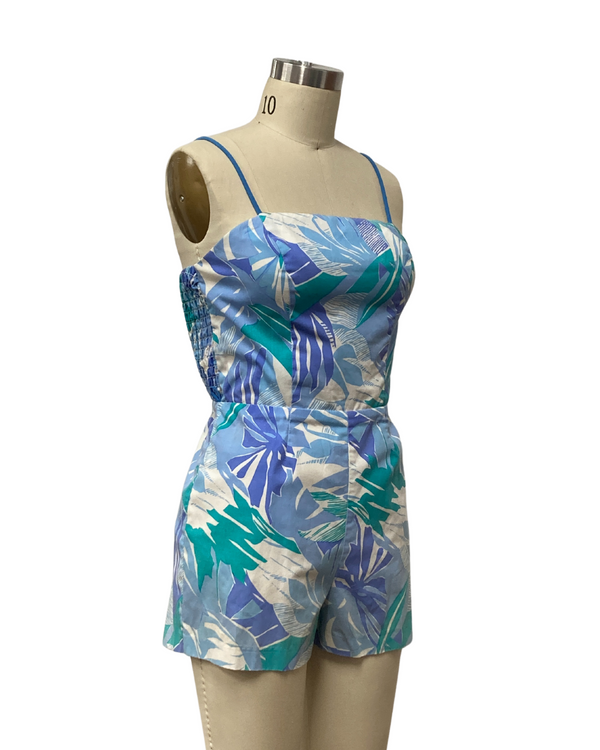 1970s LAVENDER & LIGHT BLUE TROPICAL PLAYSUIT {WAIST 30 INCHES}