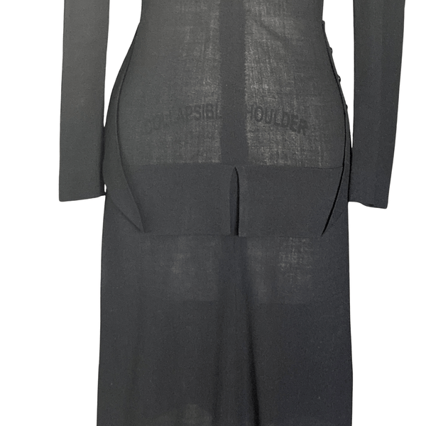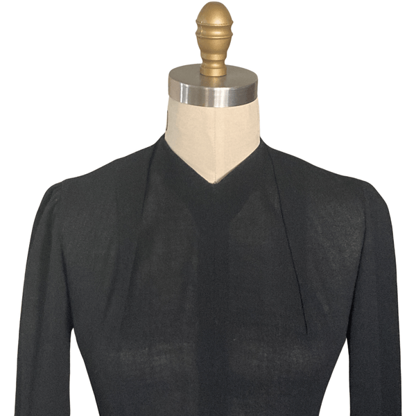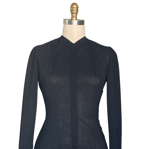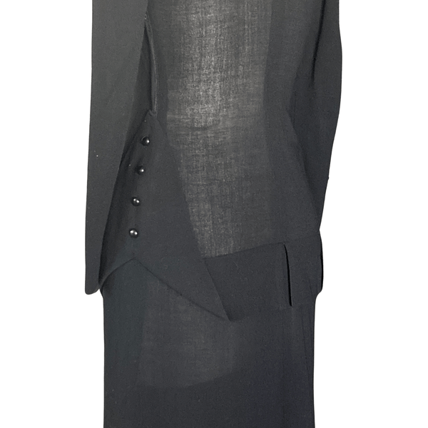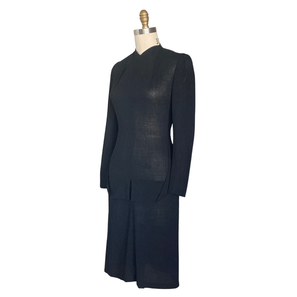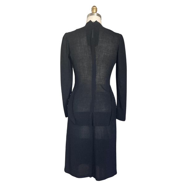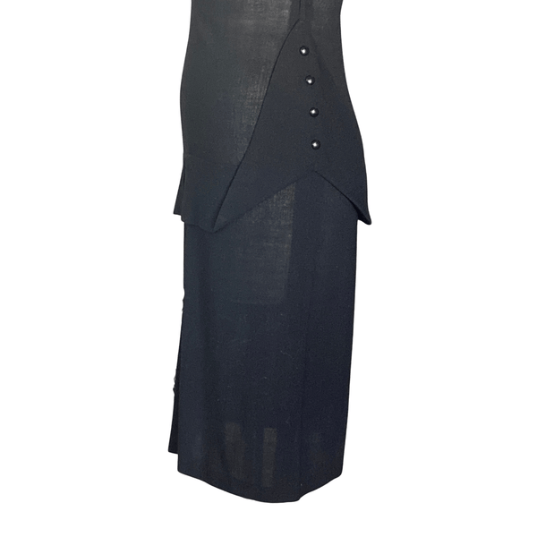 CLASSIC 1940S BLACK CREPE PEPLUM DRESS. THE PEPLUM HAS BLACK BUTTONS ON THE HIP AREA THAT GIVES THE DRESS A DRAMATIC LOOK.