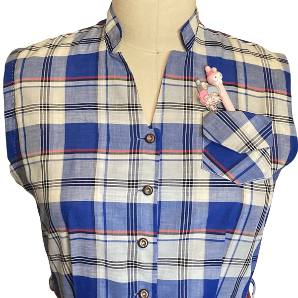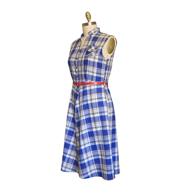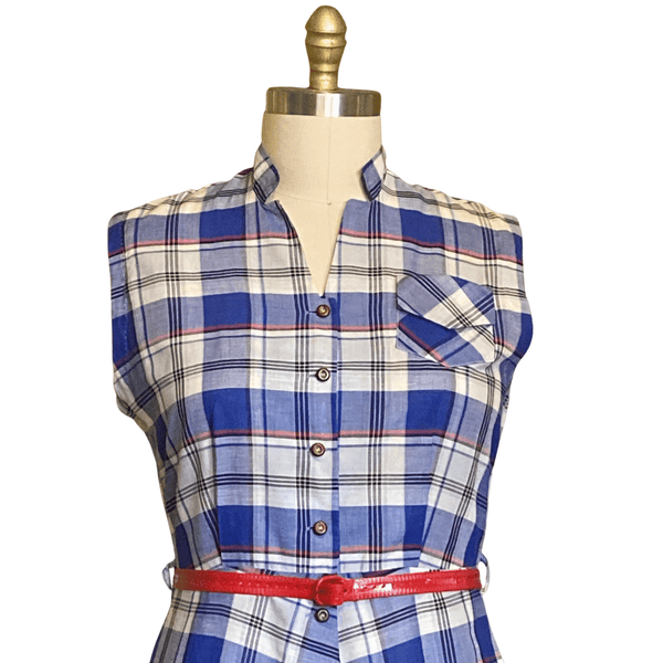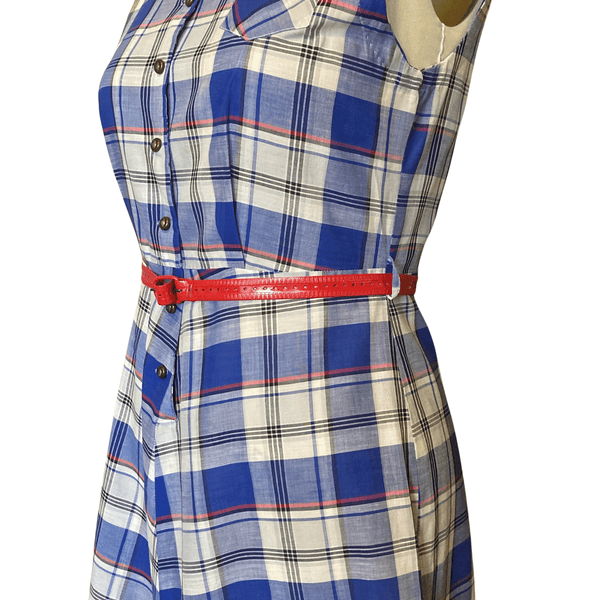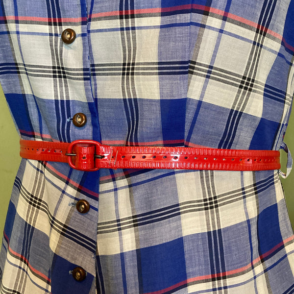 VINTAGE 1940s PLAID COTTON DAY DRESS with RED PLASTIC BELT | 1940s VINTAGE PLAID DRESS | 1940s BLUE PLAID DRESS