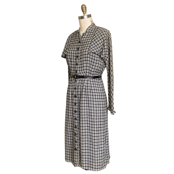 1940s HOUNDSTOOTH CAPE SLEEVES DRESS {WAIST 27 INCHES}