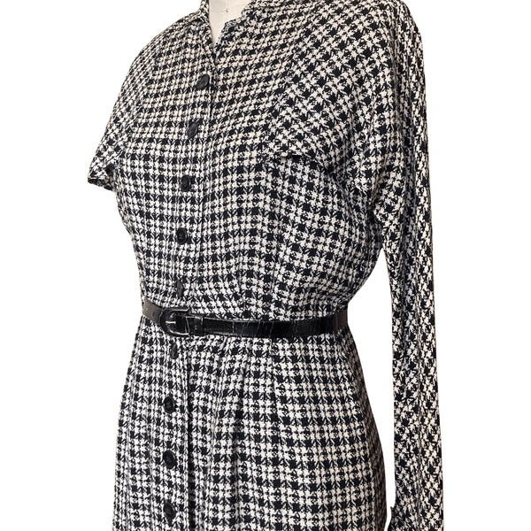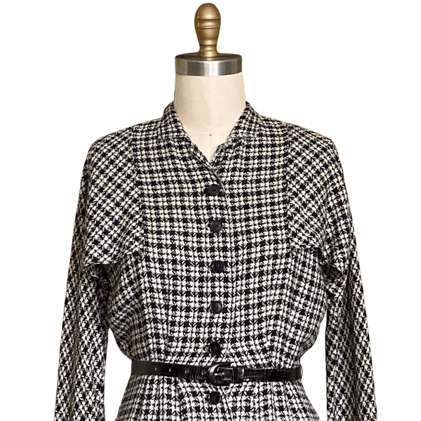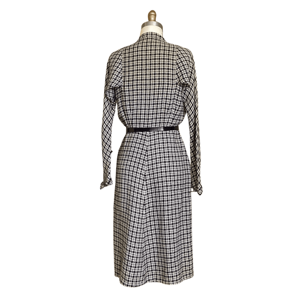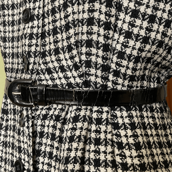 UNIQUE LATE 1940S HOUNDSTOOTH CAP SLEEVES WITH PATENT LEATHER BELT. A VERY CLASSIC & LADYLIKE DRESS.