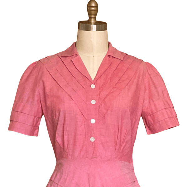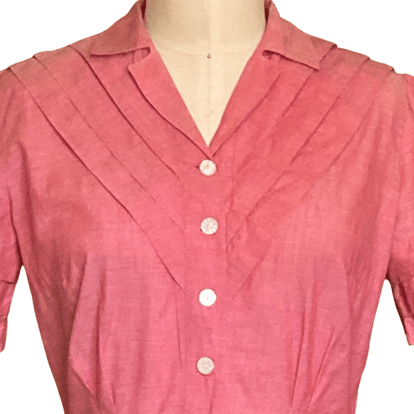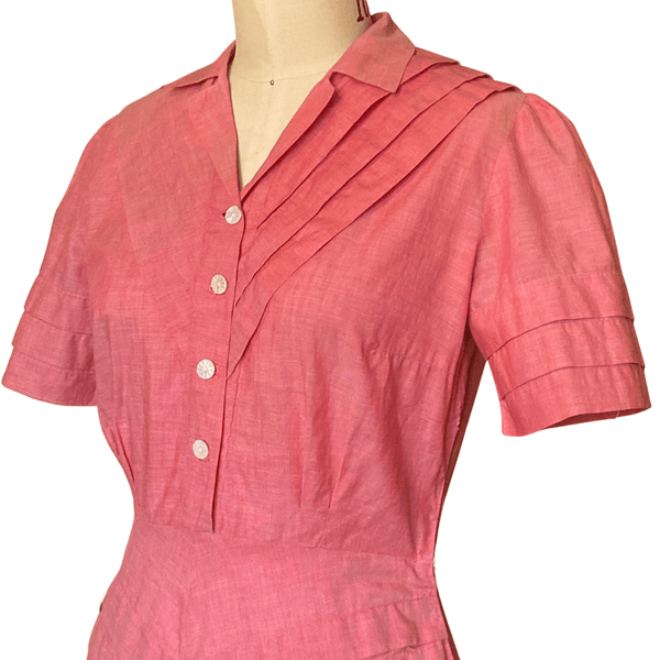 SWEET 1940s RED CHAMBRAY DAY DRESS WITH SLEEVE & HIP FABRIC PANEL DETAILS. WHAT A UNIQUE DRESS DESIGN!