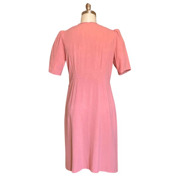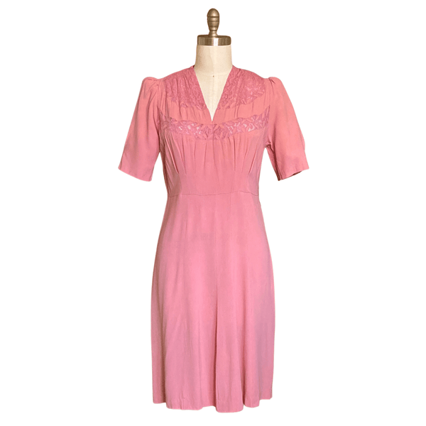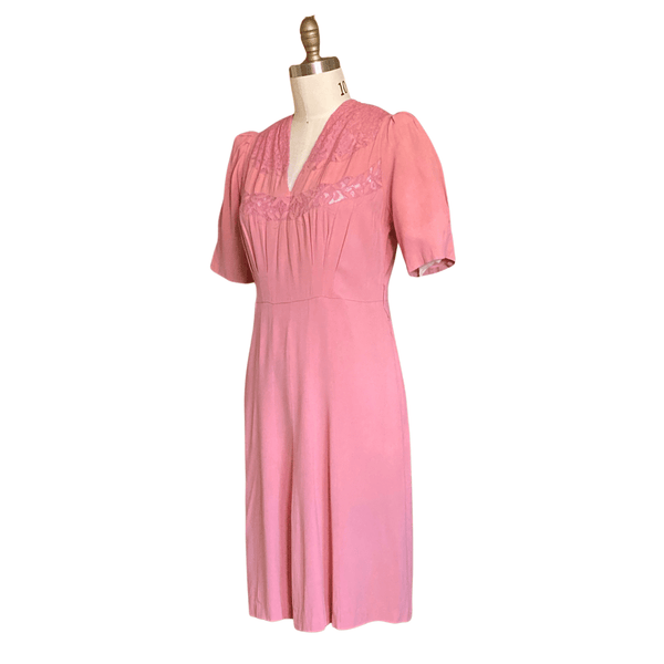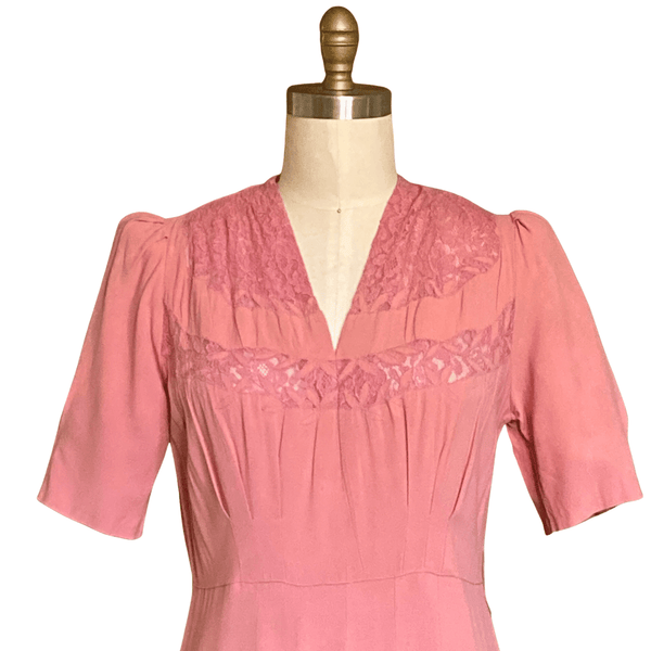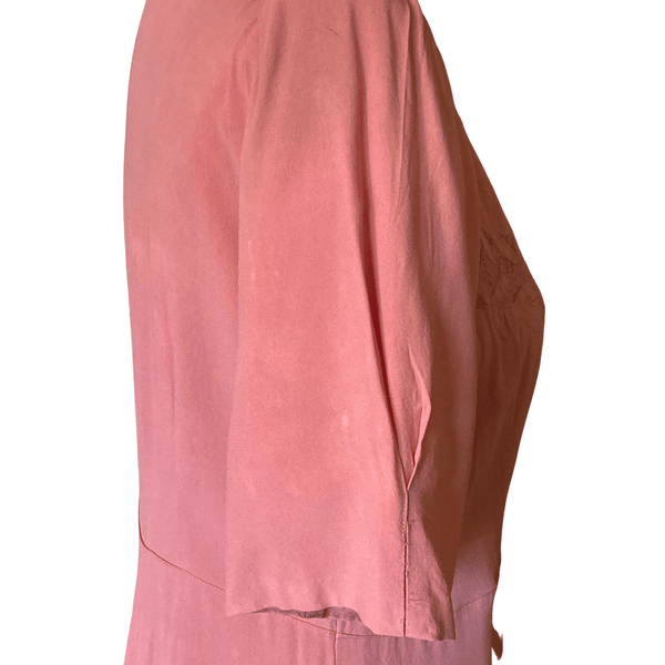 SWEET 1940s RAYON SALMON DRESS WITH LACE DETAIL. THE DRESS IS A GOOD SIZE & IS GREAT FOR DAILY WEAR!