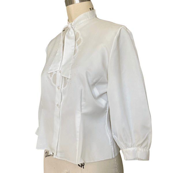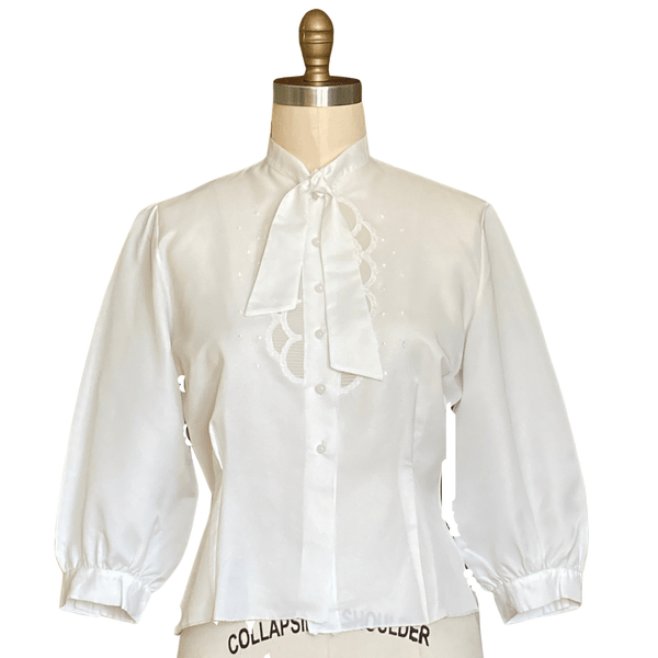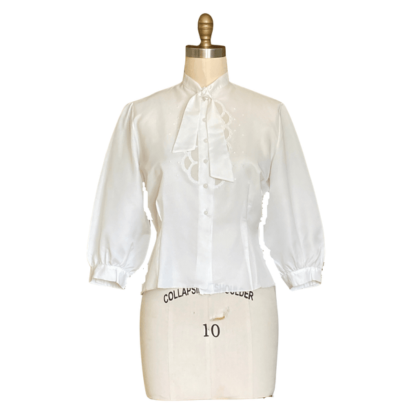QUINTESSENTIAL 1950S WHITE BLOUSE WITH BALLOON SLEEVES & A UNIQUE EMBROIDERED DESIGN.