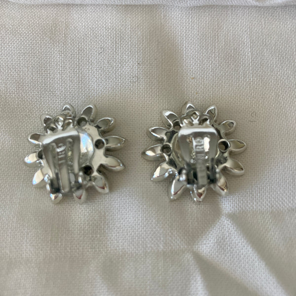 VINTAGE 1960s RHINESTONE FLOWER SHAPE CLIP ON EARRINGS | 1960s VINTAGE RHINESTONE SILVER EARRINGS | 1960s COSTUME EARRINGS