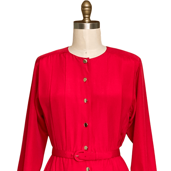CLASSY 1980s RED SILK PLEATED DRESS WITH GOLD BUTTONS & MATCHING DRESS. GREAT FOR ANY SPECIAL GATHERING.