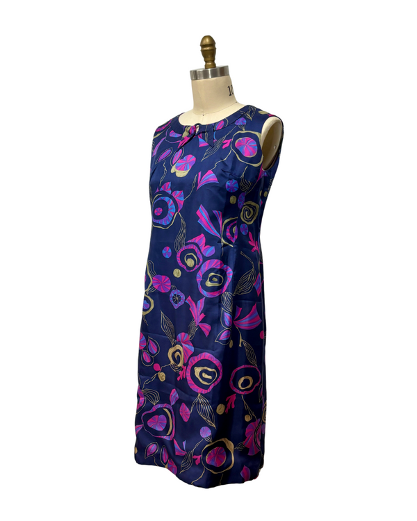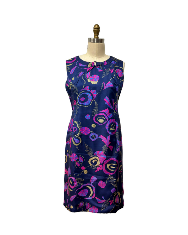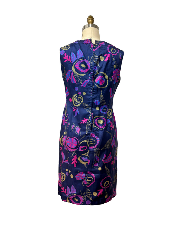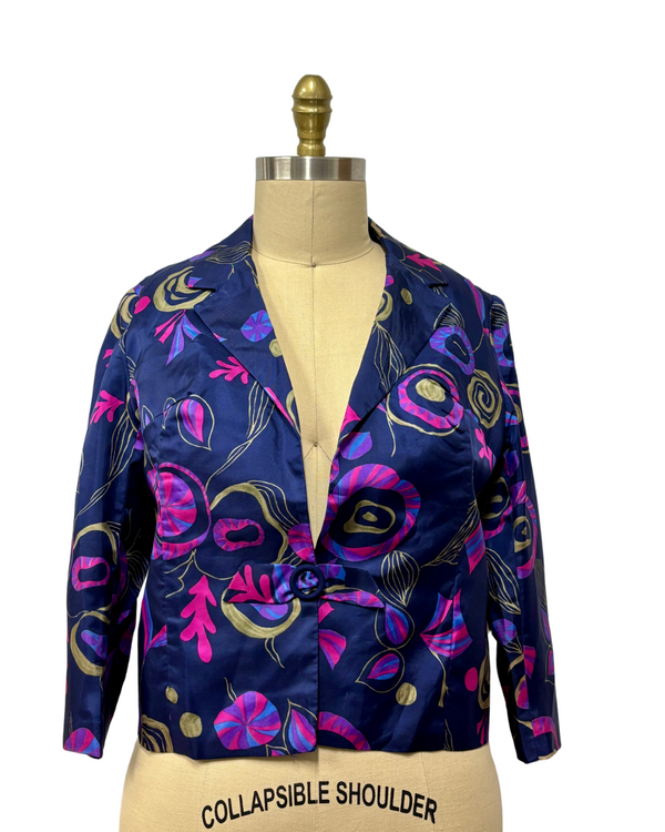 1960s NAVY & PURPLE PRINT DRESS W/ JACKET {WAIST 34 INCHES}