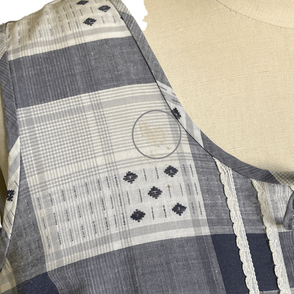 SOME LIGHT YELLOW SPOTS (LARGEST BY NECKLINE; SEE LAST PIC)
