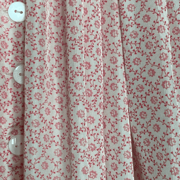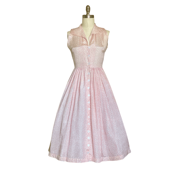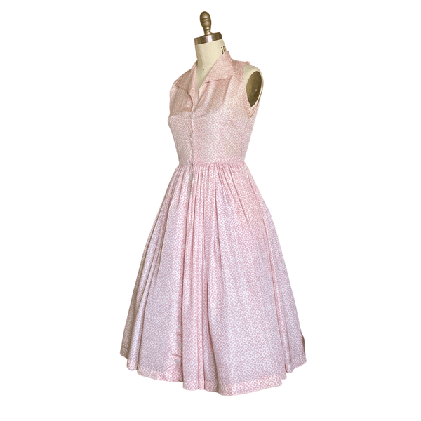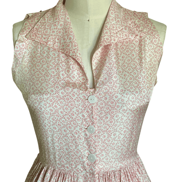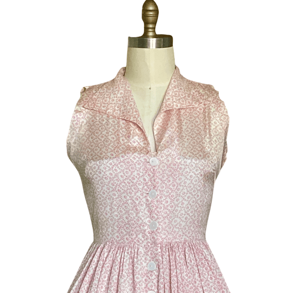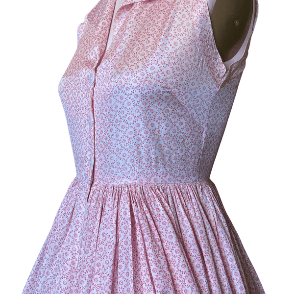 SWEET 1950s PINK MINI FLORAL PRINT DRESS WITH A FULL SKIRT & WASIT MINI PLEATS. GREAT FOR SUMMER FUN!