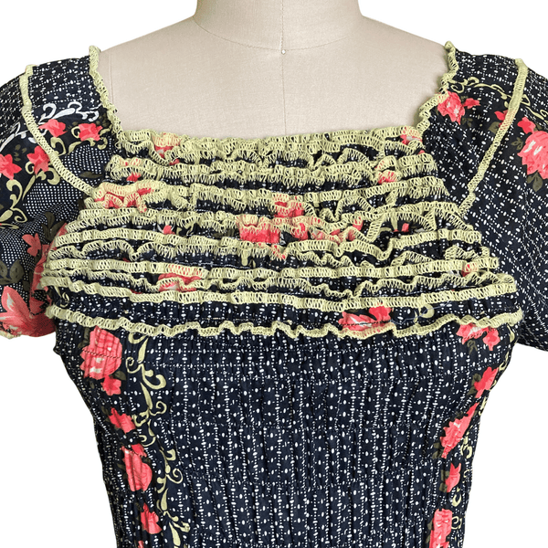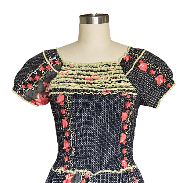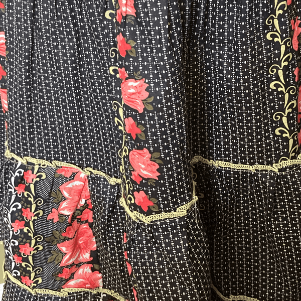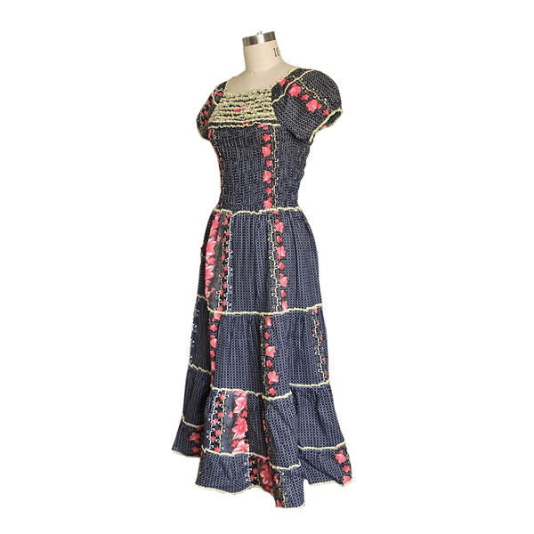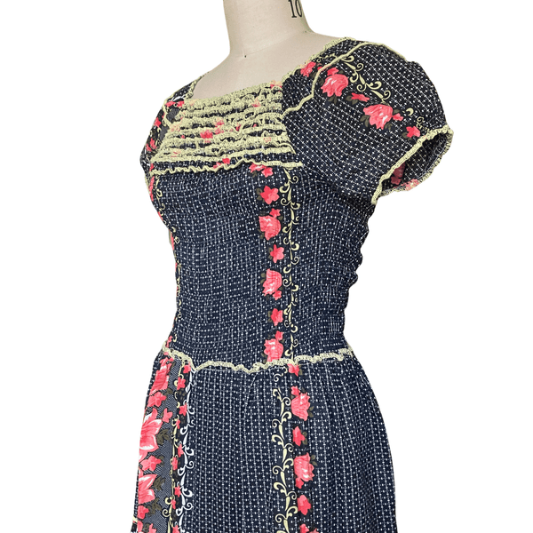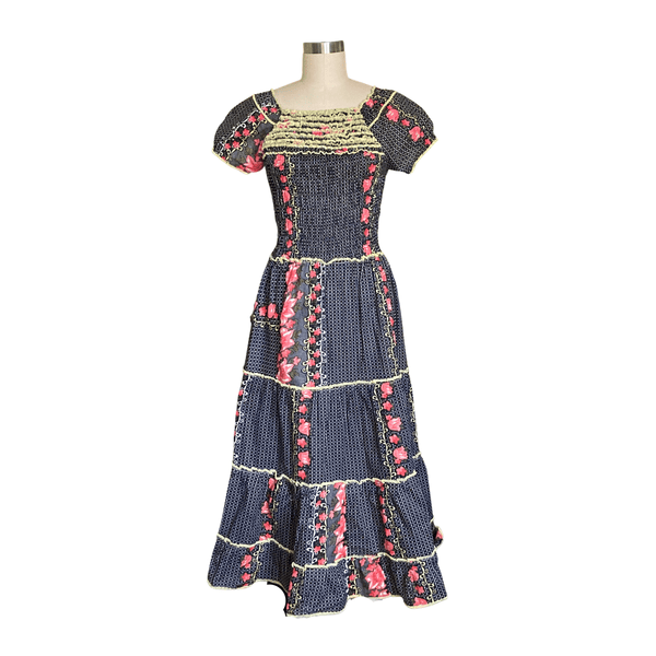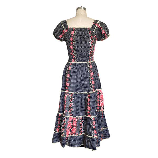 VINTAGE 1970s BLACK WITH PINK FLORAL SMOCKED PRAIRIE DRESS | 1970s VINTAGE BLACK WITH YELLOW STITCHING DETAIL BOHO DRESS | VINTAGE 1970s PRAIRIE DRESS