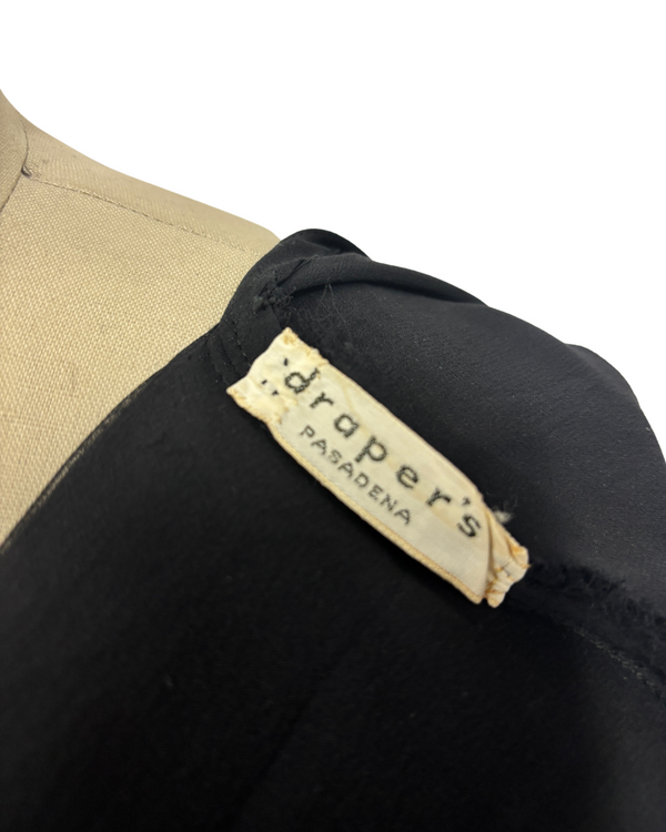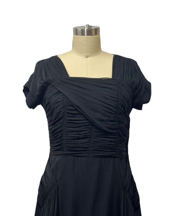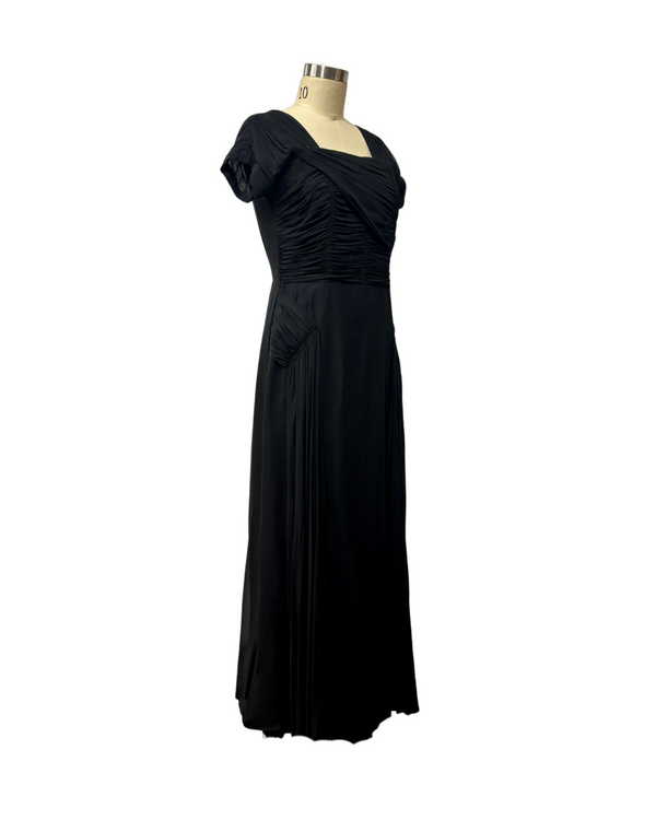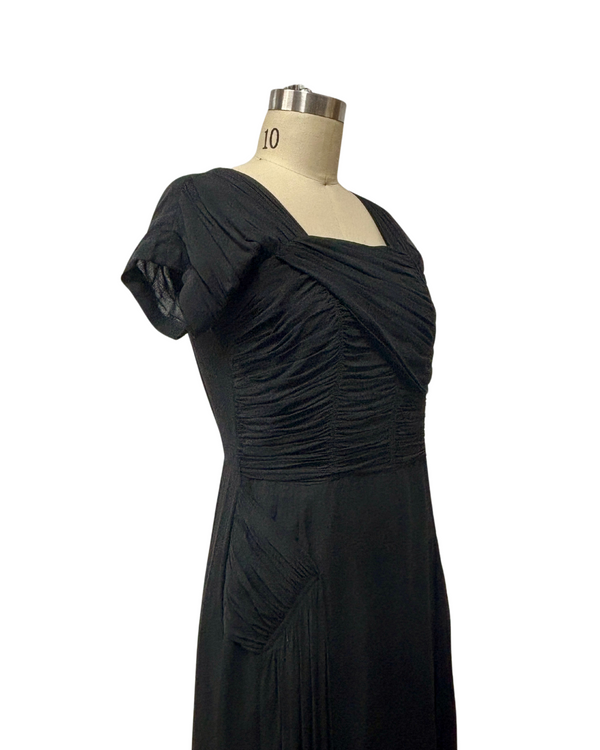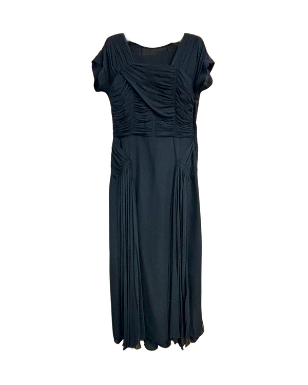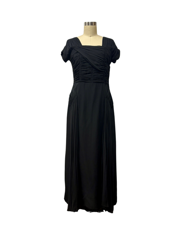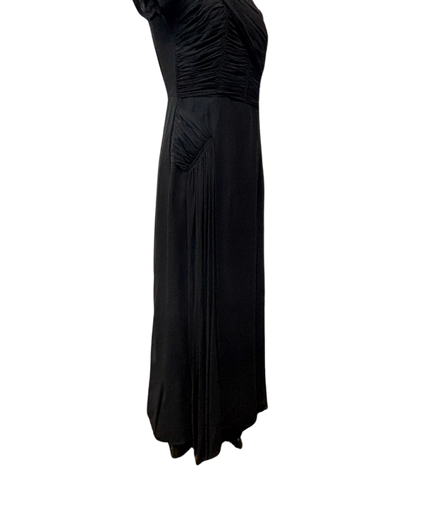 1940s BLACK CREPE CASCADING PANELS GOWN {WAIST 31 INCHES}