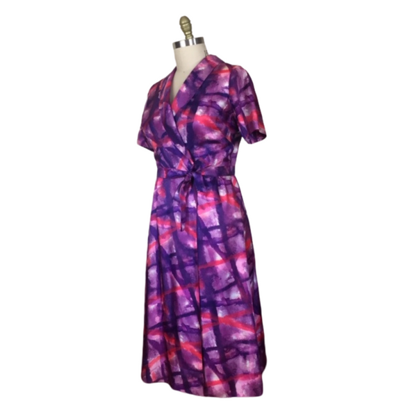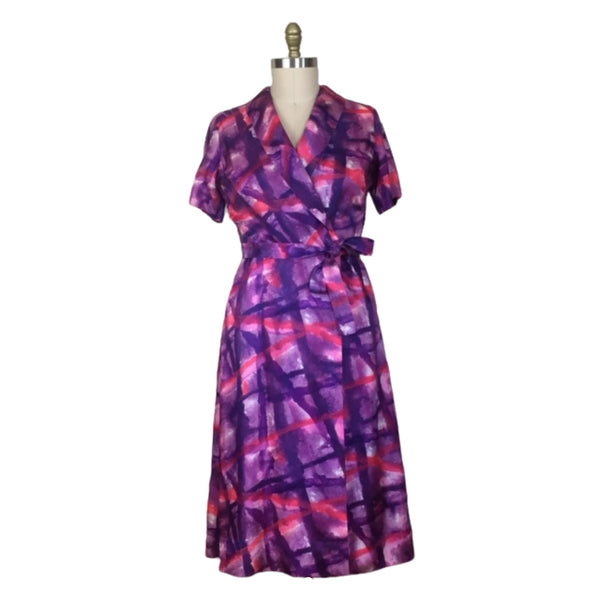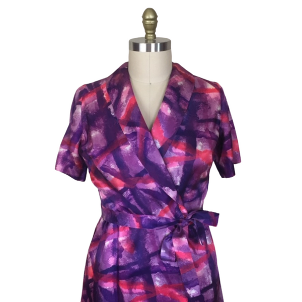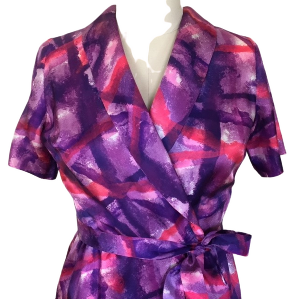 LOUNGE WEARING THIS 1950s PURPLE & PINK WRAP HOUSE DRESS. BE FASHIONABLE WILL RELAXING AT HOME.