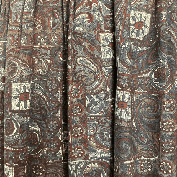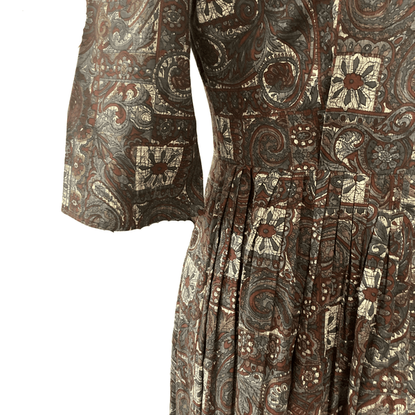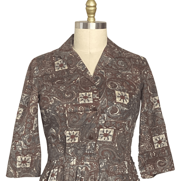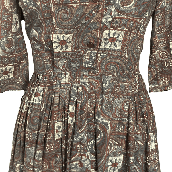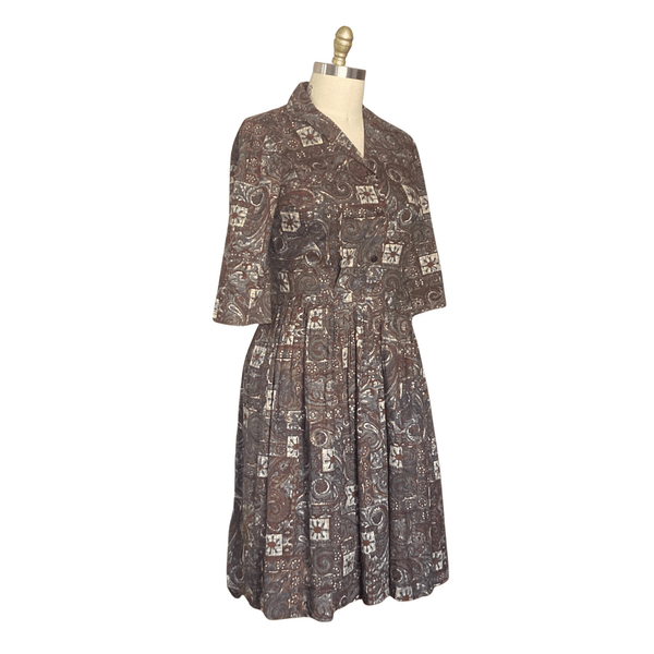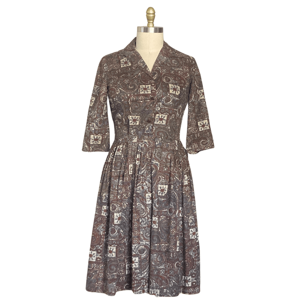 1950s BURGUNDY & GRAY PRINT DRESS {WAIST 34 INCHES}