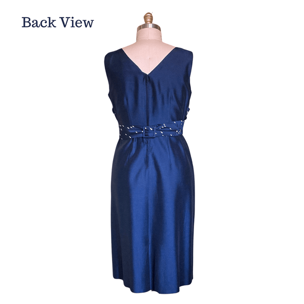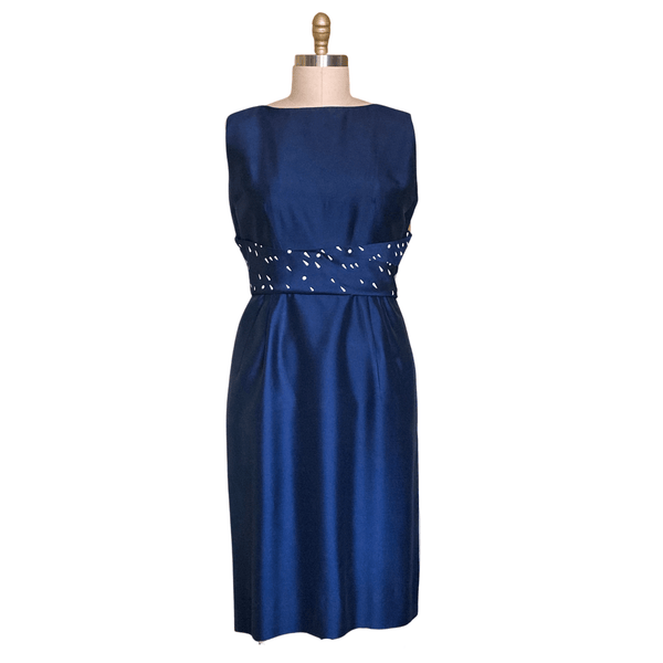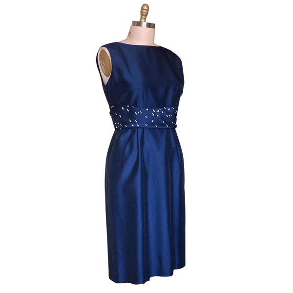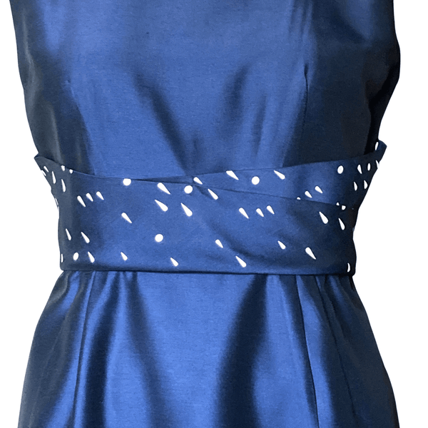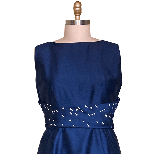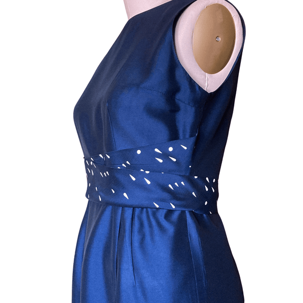 A GREAT ALTERNATIVE TO A BLACK DRESS. THIS 1950s NAVY DRESS WITH A WIDE RAINDROPS PRINT SASH. VERY CHIC!