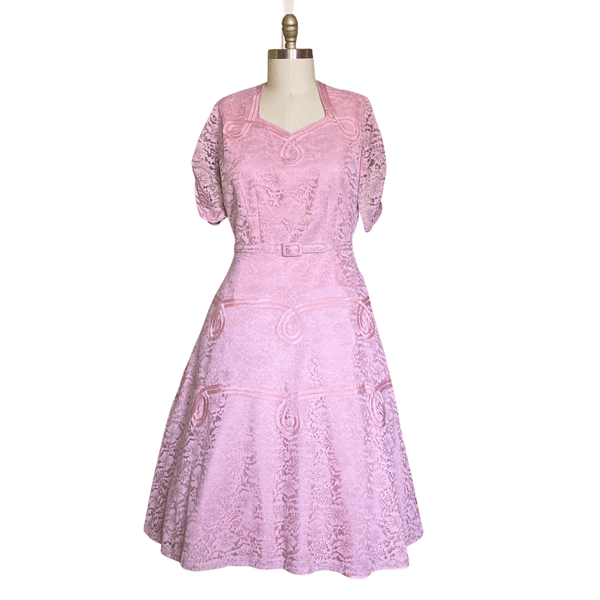 SWEET 1950s PINK LACE FULL SKIRT DRESS. THE NECKLINE & SKIRT HAVE A EMBROIDERED DESIGNED. VERY PRETTY IN PINK!