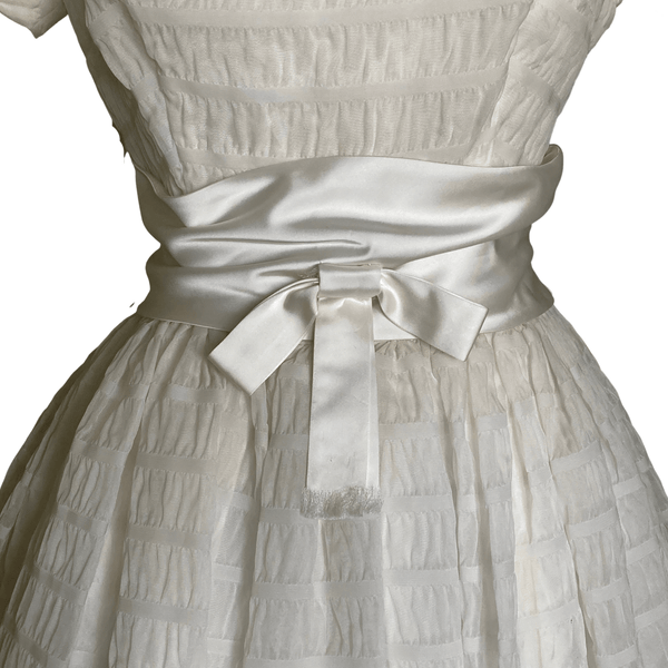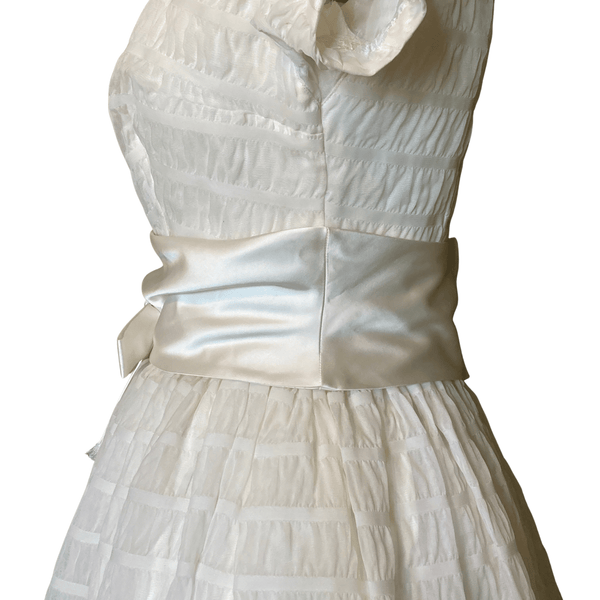 1950s CHANDELIER WHITE DRESS WITH SATIN SASH. COULD BE USED AS A WEDDING DRESS.