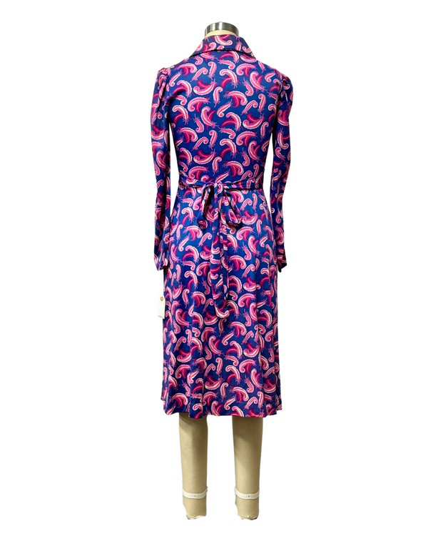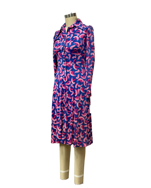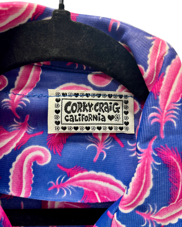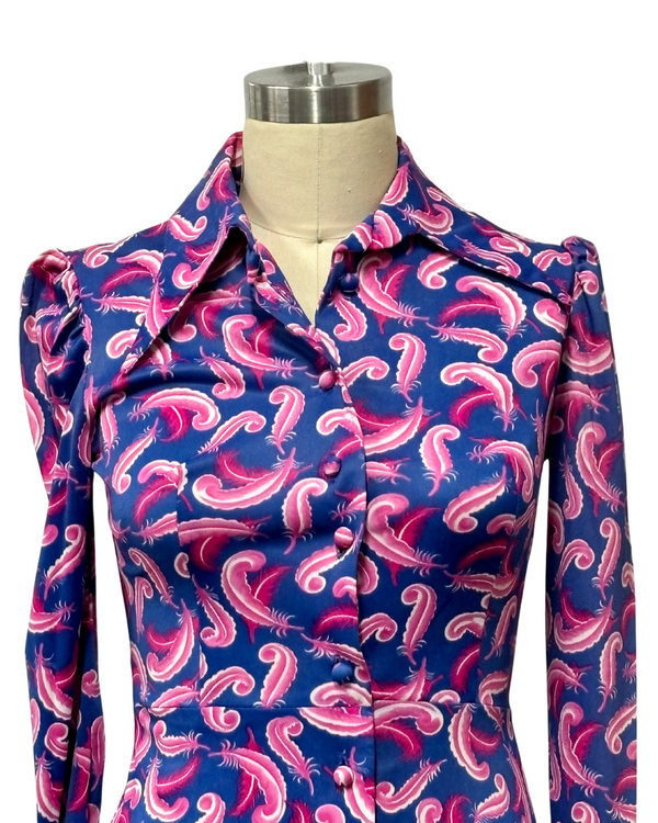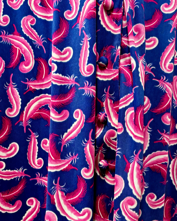 1970s PINK & PURPLE FEATHER PRINT DRESS {WAIST 28 INCHES}