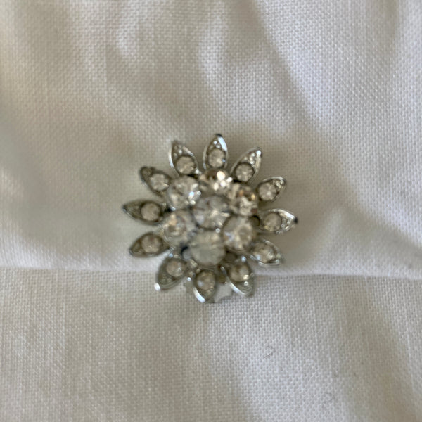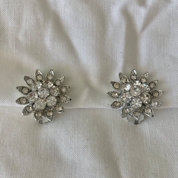 VINTAGE 1960s RHINESTONE FLOWER SHAPE CLIP ON EARRINGS | 1960s VINTAGE RHINESTONE SILVER EARRINGS | 1960s COSTUME EARRINGS