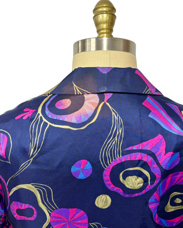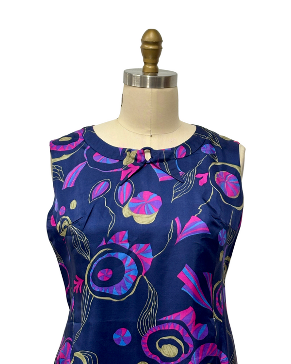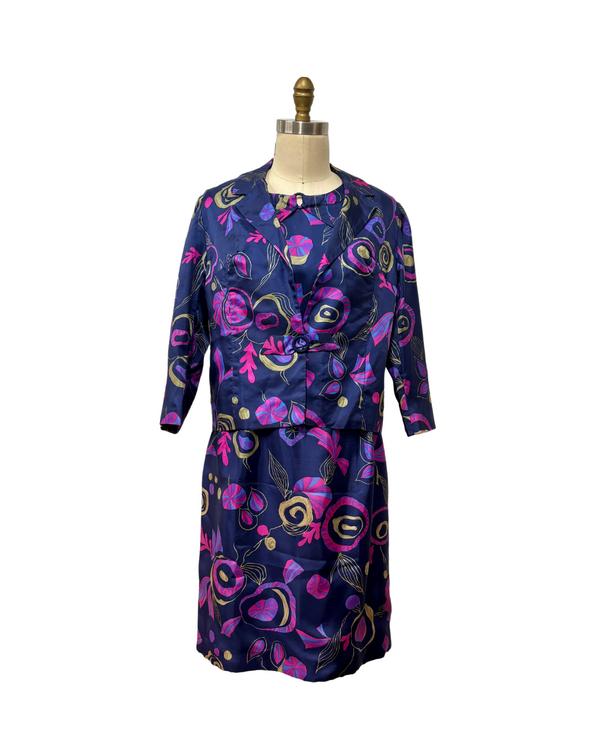 1960s NAVY & PURPLE PRINT DRESS W/ JACKET {WAIST 34 INCHES}