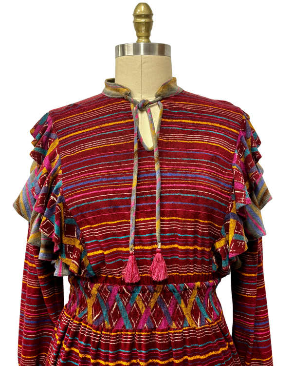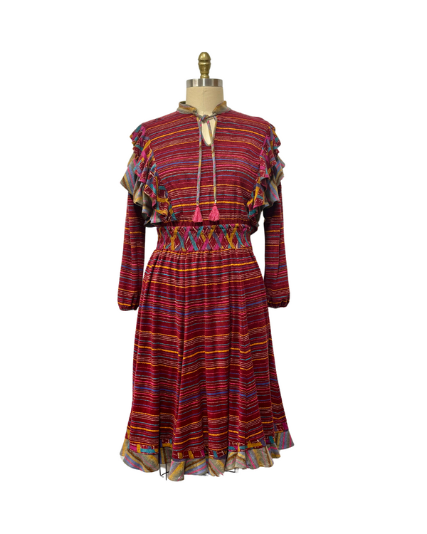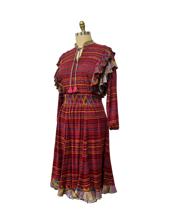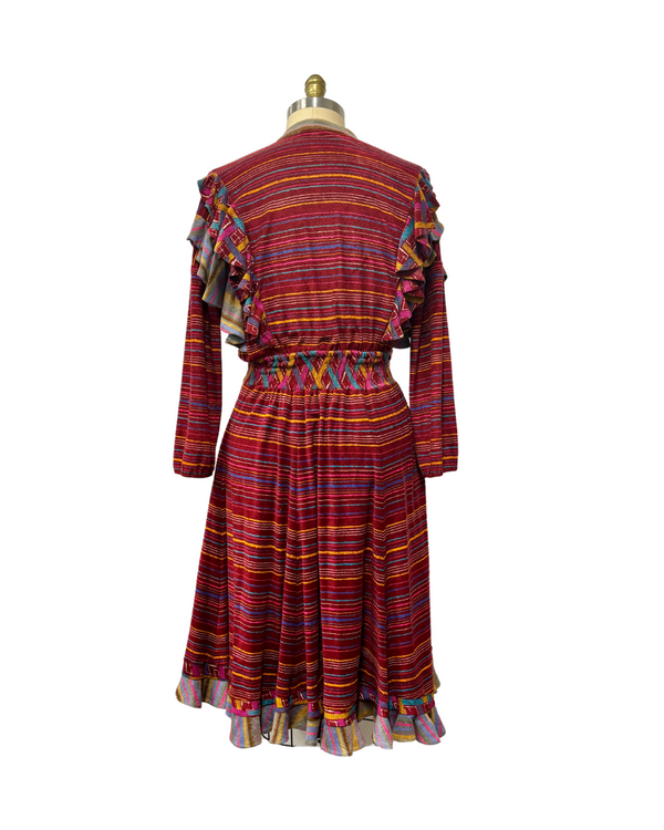 VINTAGE 1980s BURGUNDY STRIPED RUFFLES DRESS | 1980s VINTAGE DIANE FREIS WOOL DRESS