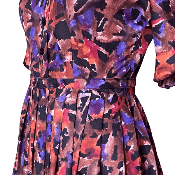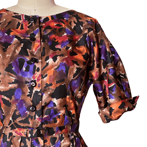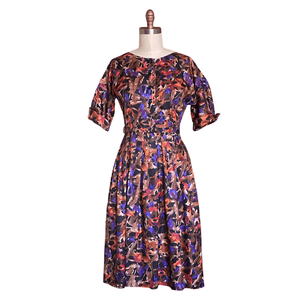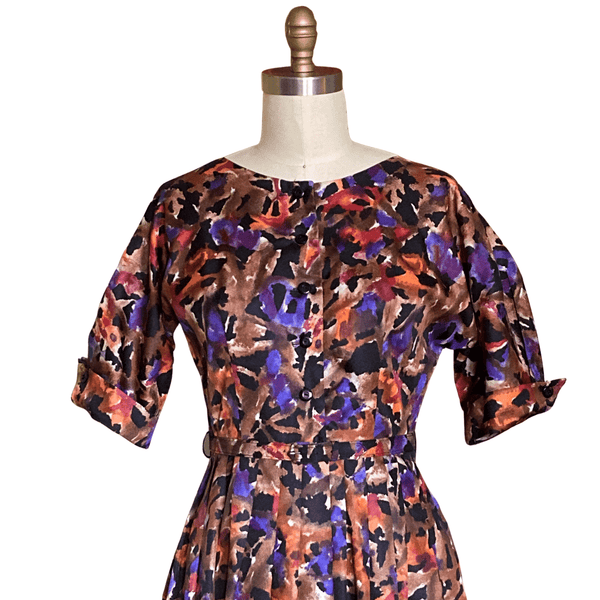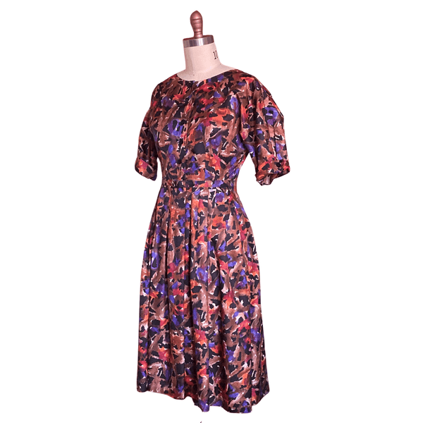 1950s BLACK & BROWN ABSTRACT PRINT DRESS {WAIST 30 INCHES}