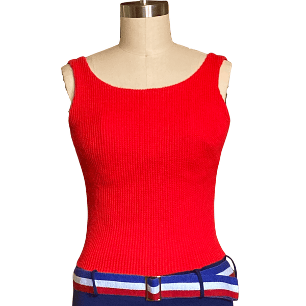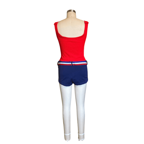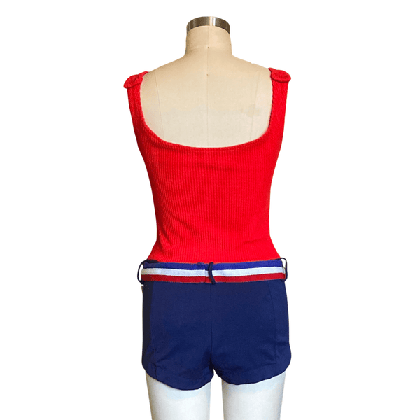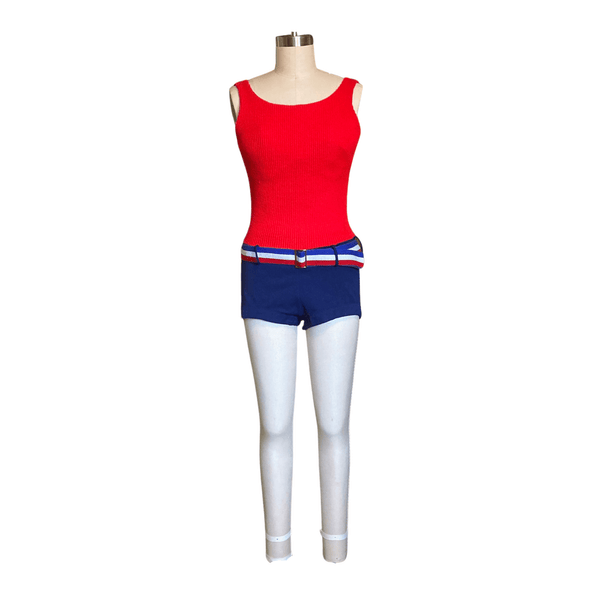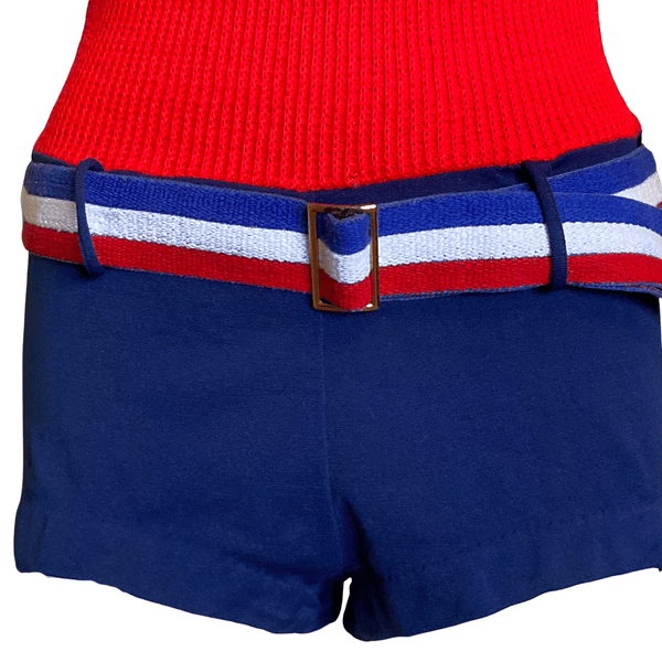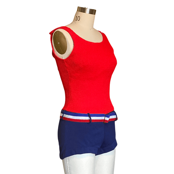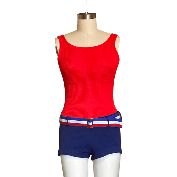 A HIP 1960S RED & BLUE BOY SHORTS SWIMSUIT ONE PIECE WITH STRIPED BELT.