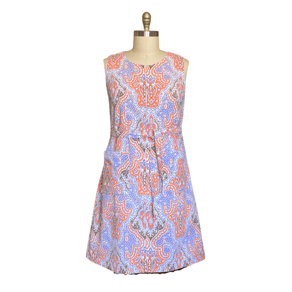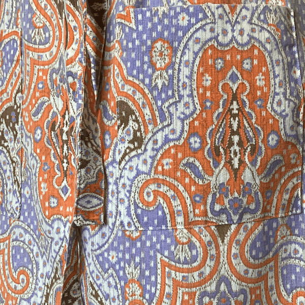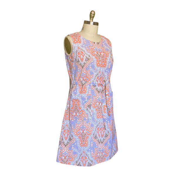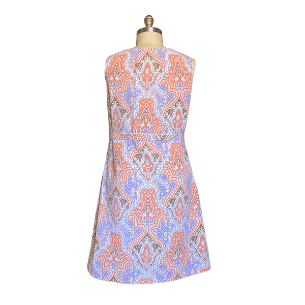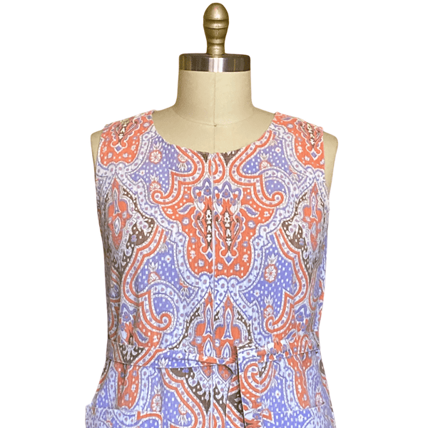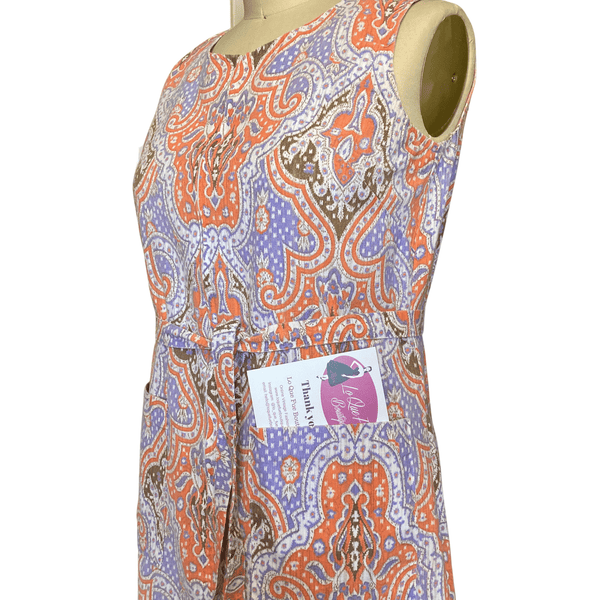 1970s ORANGE & LILAC PRINT SHIFT DRESS (WAIST 43 INCHES}